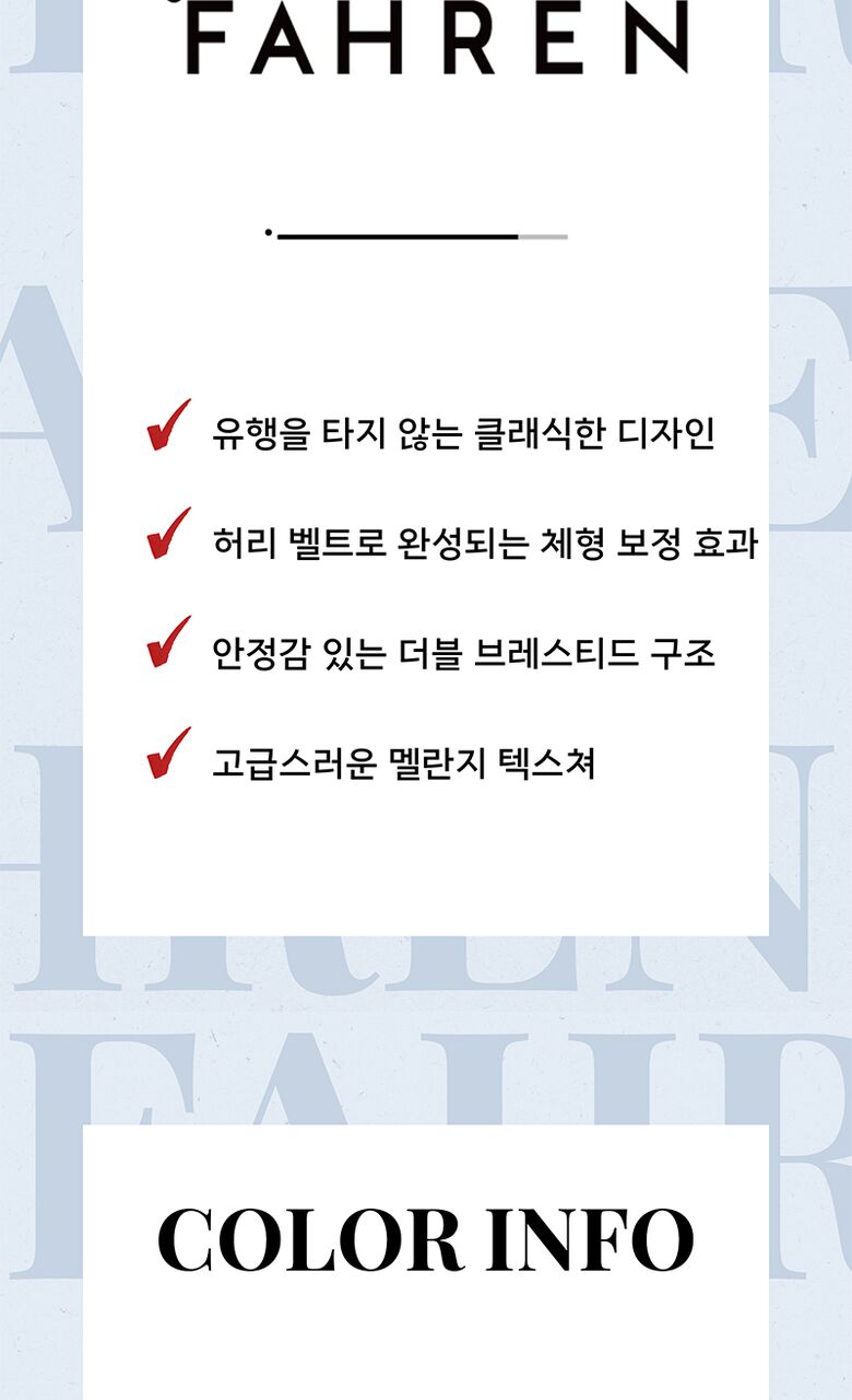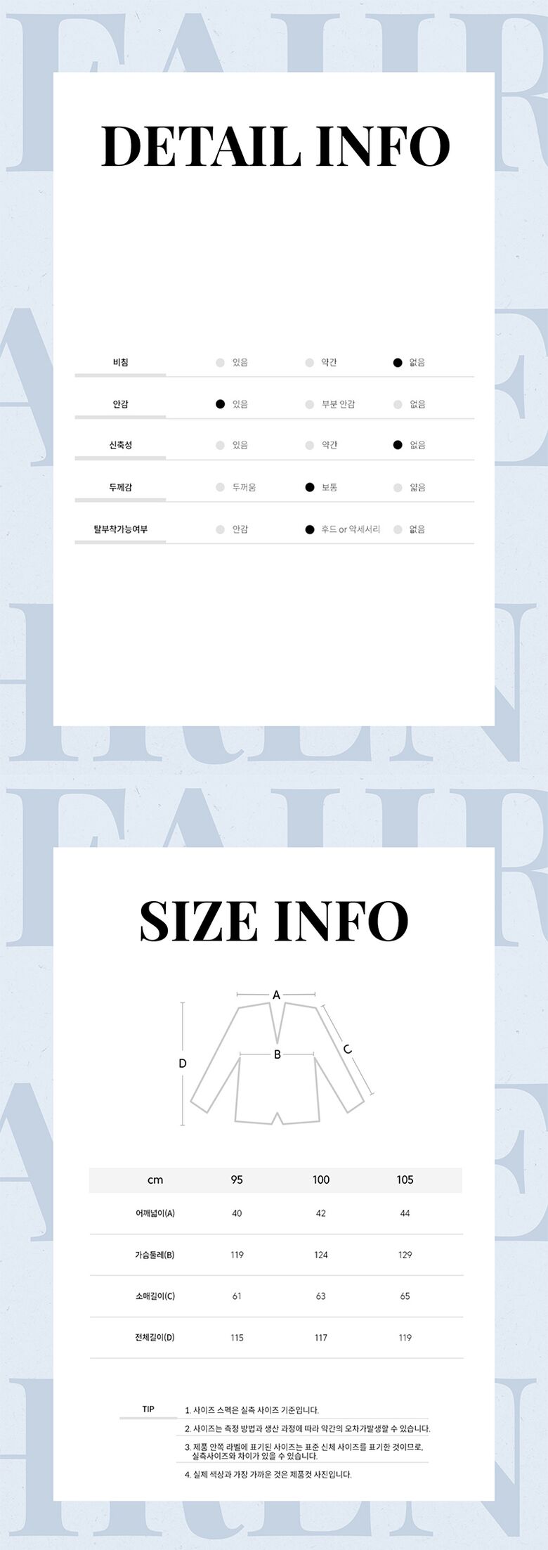 | 제품소재 | 겉감:폴리에스터 66%,레이온 29%,폴리우레탄 5% 안감: 폴리에스터 100% |
