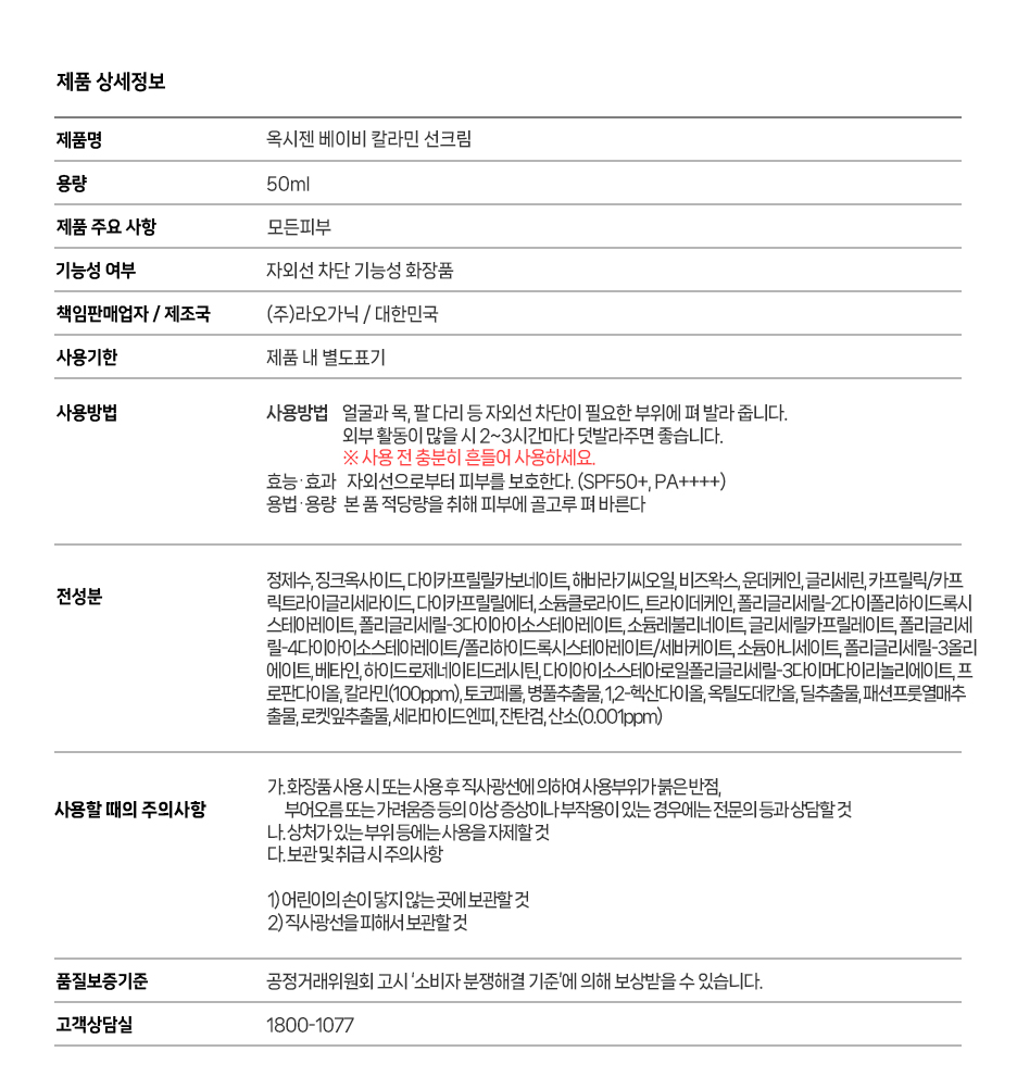 | 내용물의 용량 또는 중량 | 칼라민 선크림50g + 선스틱20g + 클렌징 워터 200ml |