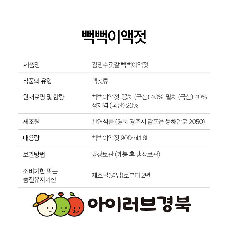 | 제품명 | 김명수젓갈 뻑뻑이액젓 1.8L |