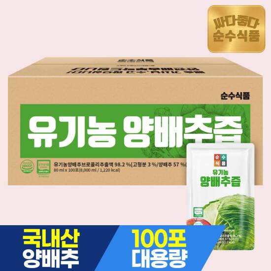 선택64 [순수식품] [비밀특가][총100포]유기농 양배추즙 실속형 100포 x 1박스 / 브로콜리 진액 유기농 사과농축액 건강즙