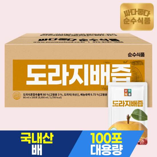 선택57 [순수식품] [비밀특가][총100포]도라지배즙 실속형 100포 x 1박스 / 배도라지즙 배 도라지 생강 건강즙