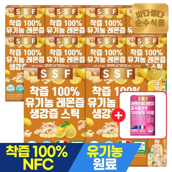 선택23) [순수식품] [4/27~29, +콜라겐90정]100% 유기농 생강즙 레몬즙 14포 x 10박스 / NFC착즙 생강청 생강차 원액 스틱