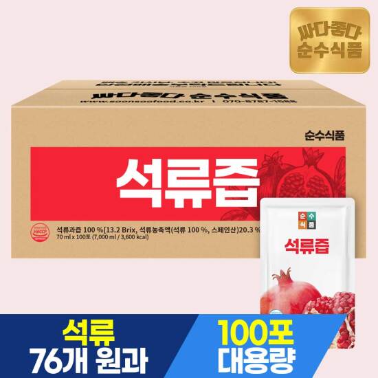 선택61 [순수식품] [비밀특가][총100포]100% 석류즙 실속형 100포 x 1박스 / 석류 원액 주스 건강즙